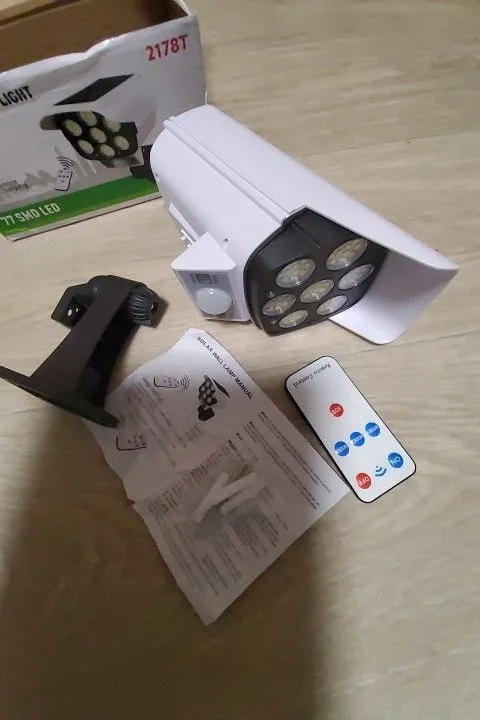 مصباح LED حائطي على شكل كاميرا يعمل بالطاقة الشمسية مع مستشعر حركة وجهاز تحكم عن بعد.